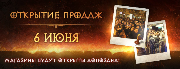 Посетители официального мероприятия открытия продаж Diablo III в России смогут приобрести стандартное издание с русской версией игры (по рекомендованной цене 999 рублей). Кроме того, во время официального открытия продаж в ограниченном количестве будет доступно европейское коллекционное издание (по розничной цене 5999 рублей), которое также включает в себя русскоязычный клиент игры. Его продажа будет осуществляться строго по 1 коробке одному покупателю. Если у вас не получается приехать в Москву на официальную церемонию, то можно заглянуть в один из магазинов России, Украины и Беларуси, которые будут работать допоздна в ночь с 6 на 7 июня.