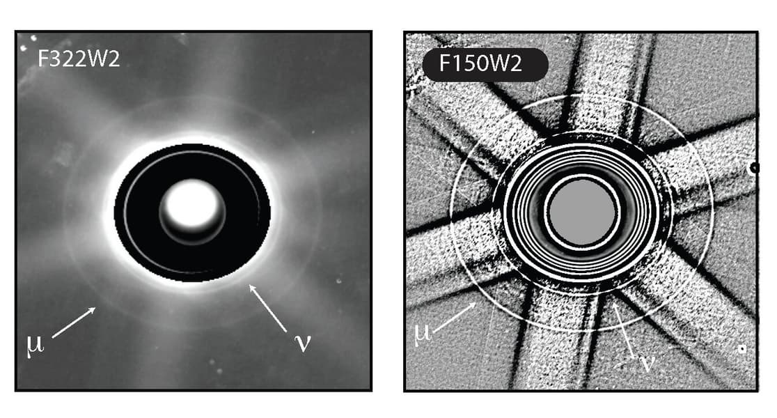 Внешние кольца Урана, наблюдаемые телескопом JWST 2 февраля 2025 года в широкополосных фильтрах. Кольца μ и ν обозначены стрелками. Изображение F322W2: для визуализации всей системы интенсивность излучения Урана и его главных колец уменьшена в 100 раз. Изображение F150W2: чтобы различить кольца μ и ν на фоне рассеянного света от Урана и главных колец, изображение было обработано фильтром верхних частот.Источник: NASA, ESA, Image processing: Imke de Pater, Matt Hedman