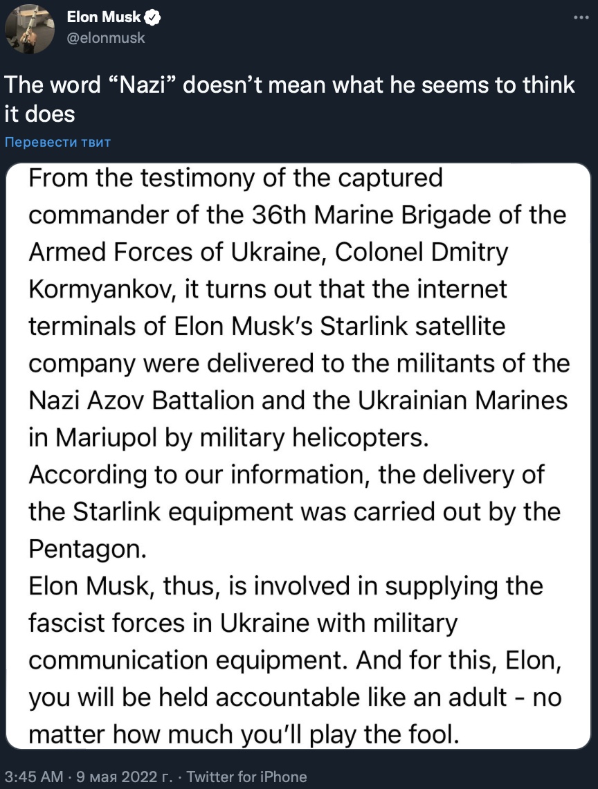 Началось все с сообщения Рогозина в Telegram 8 мая. Он заявил, что Маск причастен к поставкам абонентских ящиков Starlink нацистскому батальону «Азов».