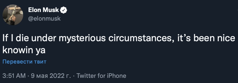 После этого Маск отправил еще один твит, в котором заявил о своей возможной смерти при загадочных обстоятельствах.