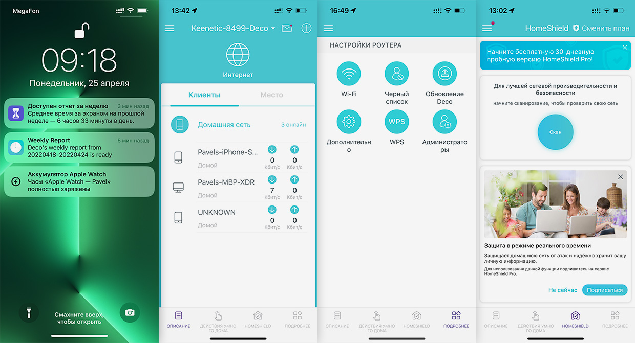 Там же в конце недели прилетает push-уведомление с недельным отчётом, можно увидеть информацию обо всех текущих подключениях, поделиться паролем без его ввода, включить родительский контроль, когда нужно ограничить время или места посещения в интернете на конкретном устройстве.
