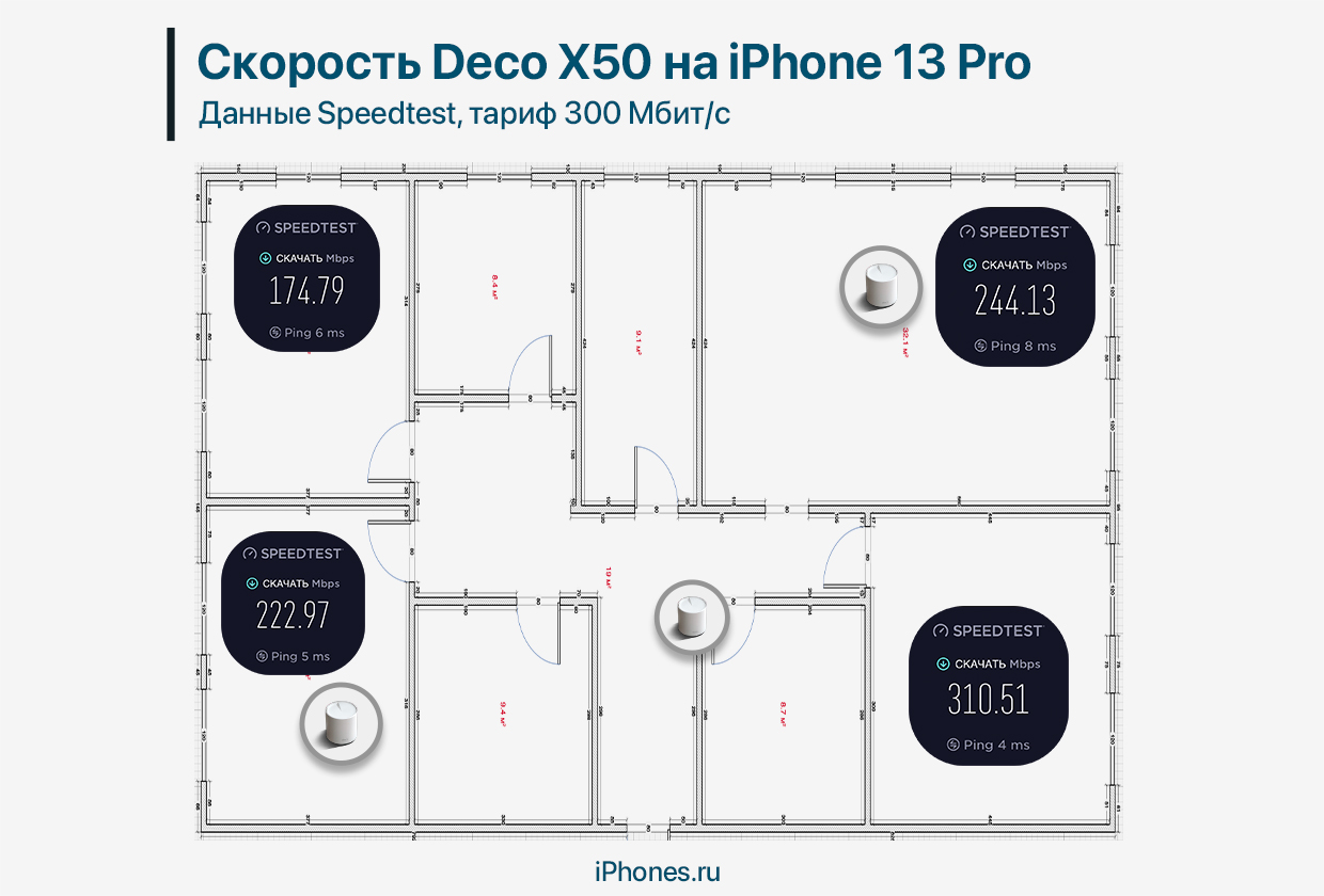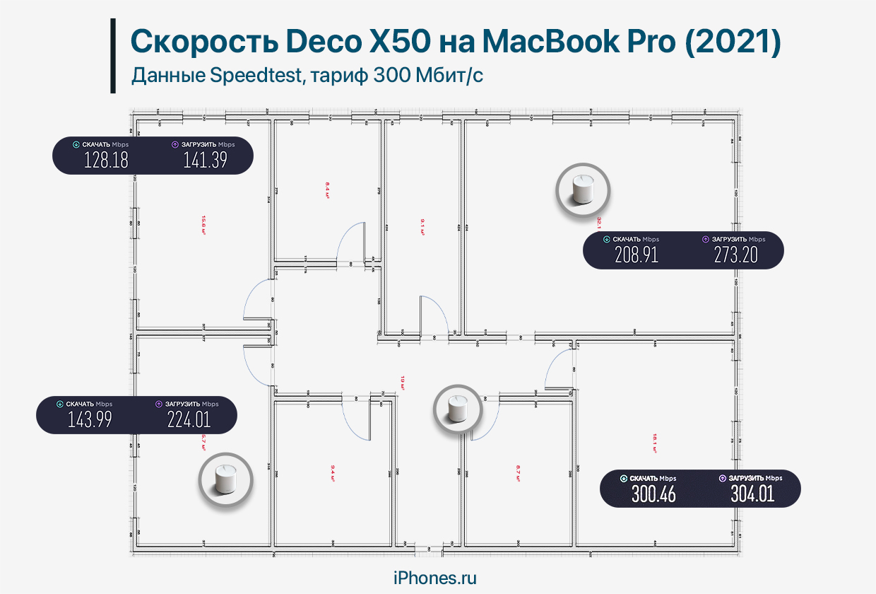 Видно, что в Спальне 1 рядом с Кухней достигаются рекордные 300 Мбит/с. Это может быть связано с тем, что сигнал не преграждают несущие стены. По той же причине Спальня 2 рядом с Детской получает самый слабый сигнал. Остальные комнаты выдают результат, свойственный тарифу. Как правило, беспроводное соединение выдаёт на 25% ниже заявленной провайдером скорости.
