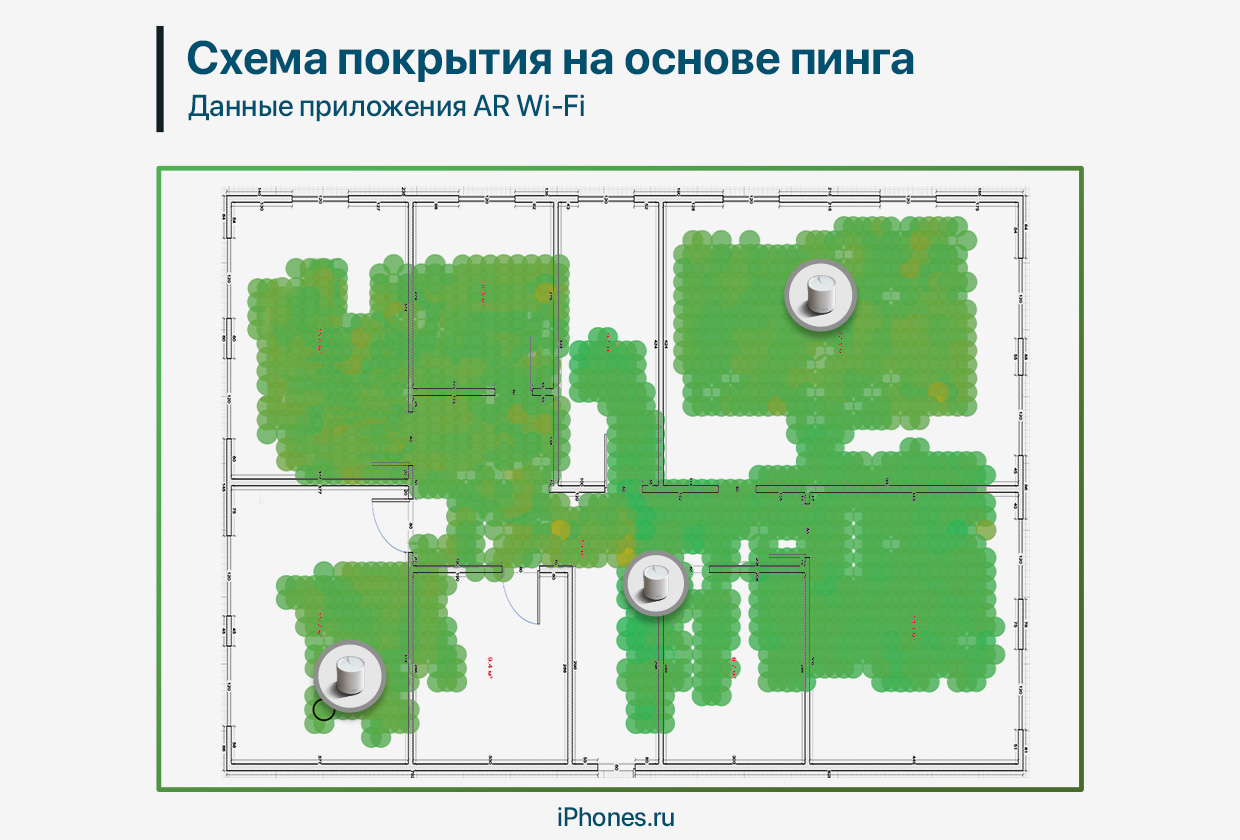 Жёлтые зоны подсвечивают задержку около 15 мс, зелёные — от 1 до 10 мс. Результаты повторяют замеры скорости: в правой нижней комнате площадь вся зелёная. В левой верхней комнате, самой удалённой от всех модулей Deco, пинг становится выше.
