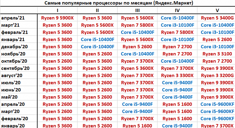 Сервис Яндекс.Маркет опубликовал статистику продаж процессоров за апрель, и на этот раз в чарте одно очень важное изменение: его больше не возглавляет шестиядерный CPU AMD! Практически полтора года лидером на нашем рынке был бюджетный шестиядерный Ryzen 5 3600, но в апреле все изменилось: теперь лидер — куда более мощный 12-ядерный Ryzen 9 5900X. Судя по всему, AMD наконец-то сделала то, что обещала: нарастила поставки Ryzen 5000, поэтому в апреле партнеры компании смогли удовлетворить спрос пользователей и на эту, и на другие топовые модели серии.