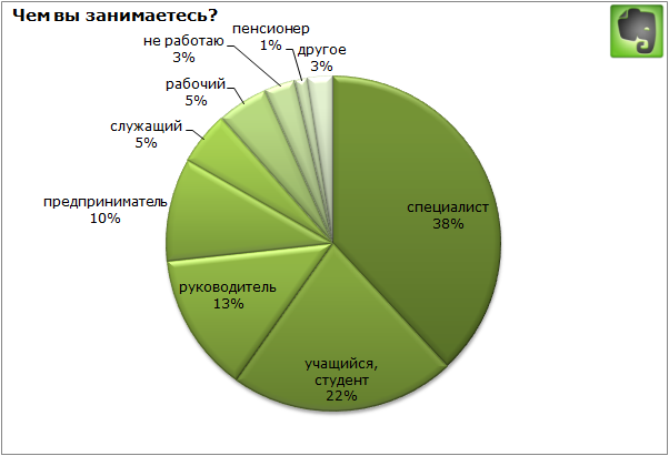 38% пользователей, участвовавших в опросе, охарактеризовали свой профессиональный статус как “специалист”. Еще 22% являются студентами и учащимися. Руководителей и предпринимателей среди пользователей Evernote тоже довольно много — 13% и 10% соответственно.