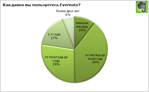 Основная часть русскоязычных пользователей Evernote — не новички. Пользуются сервисом меньше месяца лишь 11% опрошенных. У 39% опыт работы с приложением составляет от месяца до полугода, еще 28% используют Evernote от полугода до года. Отдельно стоит упомянуть 6% участников опроса, которые пользуются Evernote уже более двух лет. 23% респондентов пользуются Evernote каждый день, а еще 44% — несколько раз в неделю.