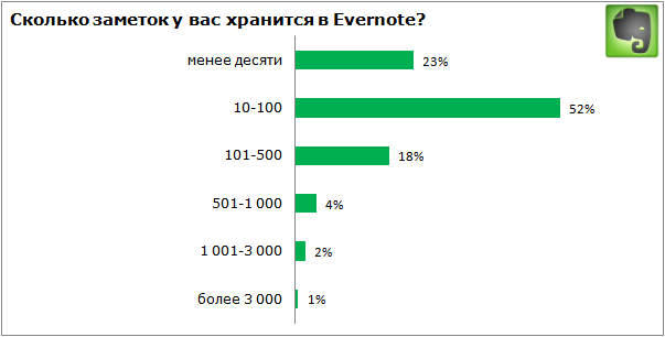 В среднем у пользователей Evernote в аккаунте хранится от 10 до 100 заметок — так ответило 52% респондентов. Менее десяти заметок хранится у 23% ответивших. У 18% насчитывается от 101 до 500 заметок. Примерно 1% пользователей хранит у себя более 3 000 заметок.
