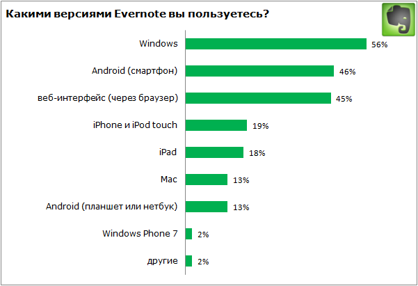 Рейтинг самых популярных приложений возглавляет Evernote для Windows, востребованный среди 56% участников опроса. Второе место занимает приложение для Android, установленное на смартфонах 46% пользователей. Примерно столько же (45%) опрошенных периодически работают с веб-клиентом. Ну а замыкают первую пятерку популярных платформ iPhone, iPod touch (19%) и iPad (18%).