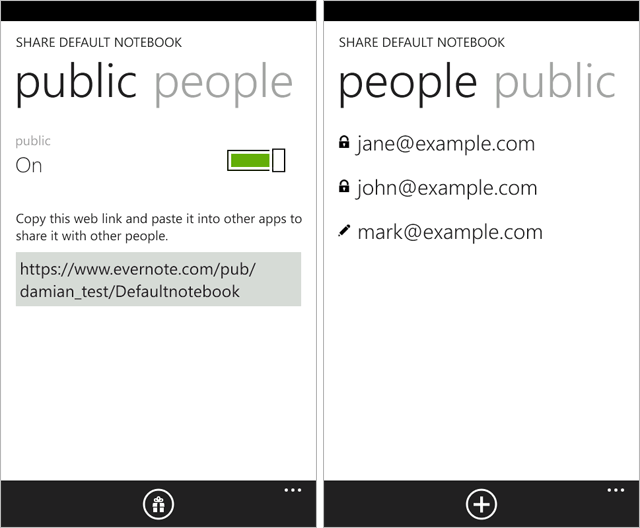 Приложение дает возможность пользователю открывать доступ к своим блокнотам как для ограниченного круга лиц, так и для любого желающего. В Evernote для WP7 появился соответствующий режим, где можно выбрать тип совместного доступа. В случае с доступом для всех будет создана ссылка на блокнот, которой можно поделиться по почте или опубликовать в социальных сетях.