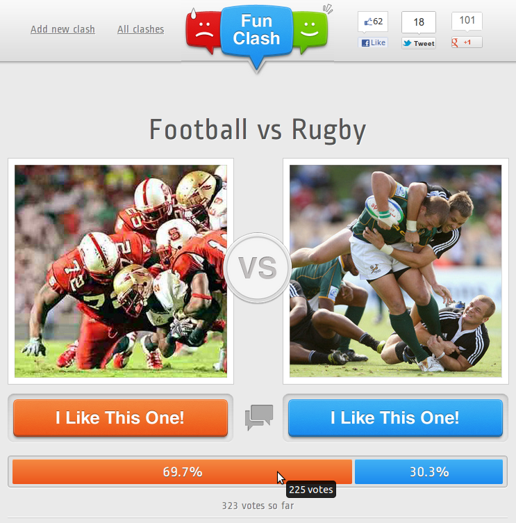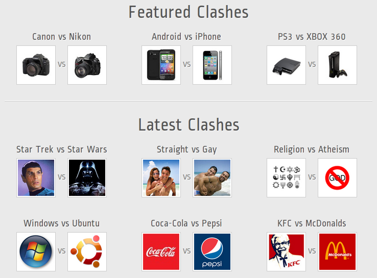 Сервис FunClash - это красивая и удобная платформа для организации виртуальных битв между любыми конкурентами или противоположностями. Проще говоря, сайт FunClash - это рассадник холиваров.