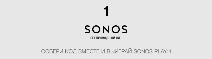 В течение 5 дней с понедельника по пятницу мы будем прятать баннеры с секретной буквой или цифрой по всему сайту. Тот, кто соберёт правильную последовательность из этих букв и/или цифр, а затем назовёт её в Москве на выставке, получит Sonos Play:1. Приходи в павильон Sonos — комната 601.