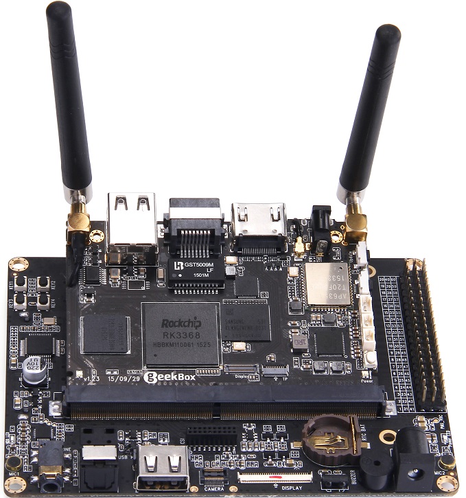 Система GeekBuying GeekBox основана на восьмиядерной 64-разрядной SoC Rockchip RK3368, успевшей засветиться в других медиацентрах. Установлено ОЗУ LPDDR3–1600 объемом 2 ГБ и флэш-накопитель eMMC 5.0 производства Samsung с потоковой скоростью чтения и записи до 250 и 90 МБ/с (до 7000 IOPS). Беспроводной адаптер AmPak AP6354 поддерживает связь в сетях Wi-Fi 802.11n/ac по схеме 2:2 и Bluetooth 4.1. Поддерживается декодирование 10-битного видео в формате H.265 и разрешении 4K с частотой до 60 к/с и его вывод посредством порта HDMI 2.0. Также на основной плате есть порт Gigabit Ethernet, два USB 2.0, один MicroUSB с поддержкой OTG, один слот для карт microSD, две коннектора для съемных антенн и вход для комплектного внешнего адаптера питания. На плате распаян трехконтактный UART и интерфейсы eDP для дисплея и сенсорной панели, двухконтактная колодка для вентилятора и кнопки включения, прошивки и перезагрузки.