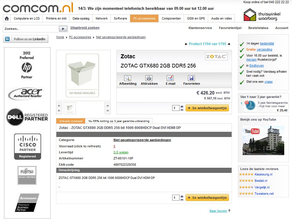 Чем ближе предполагаемые сроки официального выпуска NVIDIA GeForce GTX 680, дебют которой ожидается на текущей неделе, тем больше информации об этой интересной видеокарте становится известно широкой общественности. Очередная порция сведений пришла от голландского онлайн-магазина ComCom.nl, на сайте которого на короткое время появилось описание версии GeForce GTX 680 в исполнении Zotac. Данная модификация предлагалась по предварительному заказу по цене 426,20 евро без налогов и за 507,18 евро с учетом оных.