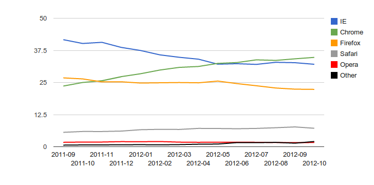 Судя по всему, Google Chrome удается не только сохранять лидирующие позиции на глобальном рынке браузеров, но и увеличивать свое превосходство над конкурентами. Об этом свидетельствуют свежие данные StatCounter, согласно которым этот интернет-обозреватель занимал в октябре чуть более трети (34,77 процента) рынка. В то же время его основной конкурент Microsoft Internet Explorer продолжает медленно, но верно терять популярность, а его рыночная доля сократилась до 32,08 процента, тогда как в сентябре она равнялась 32,7 процента. Пока неясно, сможет ли переломить ситуацию дебют IE10.
