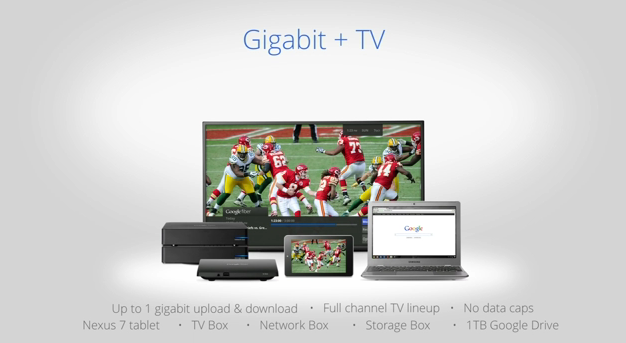 Пользователи, желающие подключиться к сервису Gigabit + TV должны платить 120 долларов в месяц. Разовый сбор за подключение в 300 долларов Google пока требует, но через некоторое время введет его. Для Gigabit + TV (контракт на два года) предусмотрены такие плюшки: гигабитный безлимитный доступ, Network Box, 1 ТБ Google Drive, накопитель Storage Box на 2 ТБ, планшет Nexus 7, а также телеприставка TV Box. Как следует из названия, на этом тарифе Google предлагает пакет телеканалов и потоковый видеоконтент Google Fiber TV.
