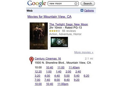 Сегодня компания Google объявила, что поиск Google для iPhone, Android и WebOS отныне предлагает расширенные функции, которые призваны «сократить для пользователя путь к кинотеатру». Например, зайдя со своего смартфона на сайт google.com, вы можете осуществить поиск по фильмам, после чего, нажав кнопку «Еще», вы увидите огромный список новых фильмов. Также, воспользовавшись картой, вы можете найти ближайший кинотеатр, в котором идет выбранный вами фильм. Помимо этого, в результатах поиска Google отображаются плакаты фильмов, рейтинги, расписания кинотеатров, а также трейлеры фильмов, которые можно просмотреть непосредственно на мобильном устройстве.