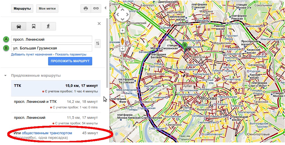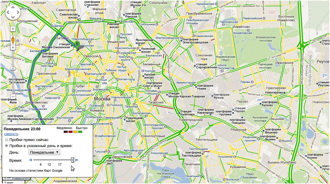 Карты Google теперь могут точно сказать, сколько времени займет запланированная поездка, принимая во внимание ситуацию на дорогах. Предусмотрена также функция, с помощью которой вы можете узнать, каким средством передвижения лучше воспользоваться и сколько времени займет поездка на общественном транспорт. Если у вас нет строгой привязки ко времени путешествия, скорее всего, вы захотите отправиться в путь, когда пробки минимальны. На Картах Google вы можете посмотреть, какой обычно трафик в указанном месте и в указанное время. Для этого просто воспользуйтесь виджетом в левом нижнем углу карты.