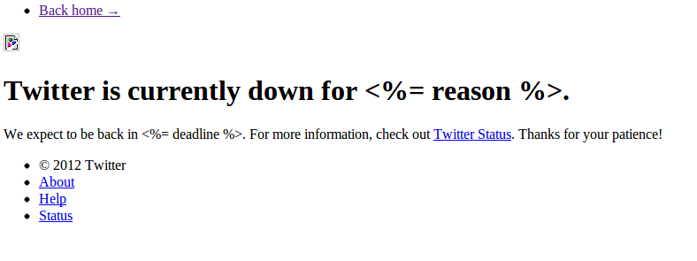 Похоже, сегодня повальная эпидемия проблем на сверх-популярных сервисах, от которых зависят множество пользователей Интернета. После продолжительного сбоя Google Talk, в офлайн ушел сервис микроблогов Twitter. Администрация проекта уже признала проблему и работает над ее решением. Правда, пока сказать им особо нечего, поскольку инженеры только-только начали исследование вопроса. На данный момент в веб-версии и мобильных клиентах выдается грустное сообщение "Twitter is currently down for <%= reason="">". Изначально пользователи мобильных версий еще могли достучаться до Twitter.
