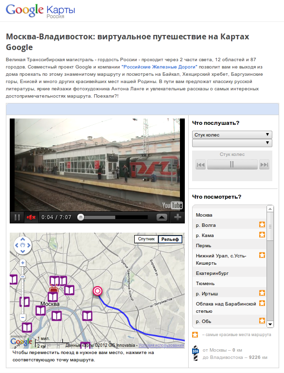 Вообще, в проекте Google/transsib интерес представляет не только контент от "РЖД", но и сайт от Google. Это отличная демка для современных сетевых технологий и отличная реклама для служб Google, на которых всё и сделано.