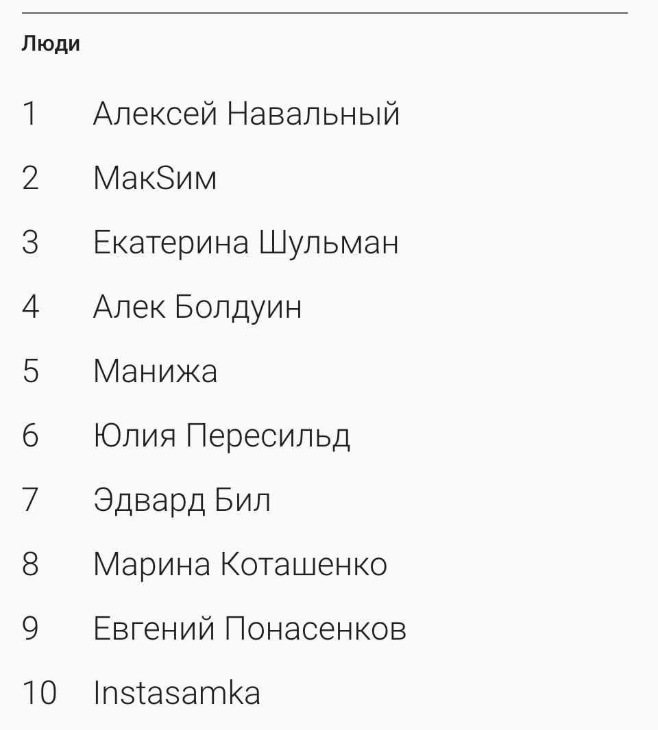 Самым популярным человеком стал Алексей Навальный. Следом за ним идут певица MaкSим и Екатерина Шульман.