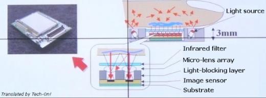 Hitachi анонсировала модуль распознавания отпечатка пальца толщиной всего 3 мм. Это в 7 раз меньше существущего модуля, имеющего толщину 23,5 мм. Значительное уменьшение толщины достигнуто за счет того, что каждый пиксель CMOS-сенсора имеет собственную микролинзу. CMOS-сенсор имеет размер 150*100 пикселей с шагом между микролинзами 0,1 мм. Каждый пиксель отделен от соседнего светонепроницаемым слоем. Через линзы проходит и фиксируется сенсором только излучение, направленное перпендикулярно, что также увеличивает качество изображения. Ранее передача изображения осуществлялась через единую линзу. И для получения сфокусированного изображения требовалось значительное расстояние. Работа модуля основана на пропускании через кожу излучения, близкого по спектру к инфракрасному. Вероятность нераспознавания правильного отпечатка в новом модуле близка к 0,01%. Вероятность признания чужого отпечатка за верный - 0,0001%. Время распознавания около 1 секунды. Размер модуля 30*25*3 мм. Компания планирует наладить серийный выпуск нового модуля в течение двух лет.