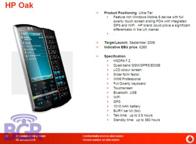 Компания Hewlett Packard готовит к выпуску новый коммуникатор. Предварительная информация о модели под кодовым HP Oak появилась в неофициальном роадмапе на 2008 год оператора Vodafone. Согласно роадмапу, HP Oak будет выполнен в форм-факторе, аналогичном смартфону HTC S710 (Vox) и некоторым японским коммуникаторам - с двумя клавиатурами, стандартной цифровой и выдвигающейся сбоку QWERTY. Судя по изображениям, коммуникатор получит довольно привлекательный дизайн и будет отличаться тонкостью. Предположительные характеристики HP Oak: - Операционная система Windows Mobile 6 Professional - Стандарт HSDPA со скоростью передачи данных до 7,2 Мбит/c - Сенсорный дисплей (разрешение не уточняется) - GPS, Wi-Fi, Bluetooth и USB - QWERTY-клавиатура - Аккумулятор ёмкостью 1010 мАч - Время работы в режиме разговора до 3,5 часов - Время работы в режиме ожидания до 360 часов Выпуск коммуникатора HP Oak запланирован на сентябрь этого года. Ожидается, что он будет стоить у Vodafone 250 фунтов стерлингов.