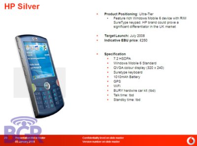 В планах оператор Vodafone на 2008 год была обнаружена первая информация о новом Windows Mobile смартфоне от компании Hewlett Packard. Модель под кодовым названием HP Silver будет выполнена в форм-факторе моноблока с гибридной клавиатурой "RIM SureType", сочетающей цифровые кнопки с клавишами для набора текста. Среди талантов смартфона - поддержка стандарта HSDPA со скоростью передачи данных до 7,2 Мбит/c, поддержка беспроводных сетей Wi-Fi и GPS-навигации. Предположительные характеристики HP Silver: - Операционная система Windows Mobile 6 Standard - Поддержка стандарта HSDPA со скоростью передачи данных до 7,2 Мбит/c - Дисплей с разрешением QVGA (320х240 пикселей) - GPS и Wi-Fi - SureType-клавиатура - Аккумулятор ёмкостью 1010 мАч Ожидается, что модель будет выпущена в июле 2008 года. Ориентировочная цена составляет 250 фунтов стерлингов. На данный момент, Hewlett Packard не анонсировала смартфон официально и вся информация носит предварительный характер.