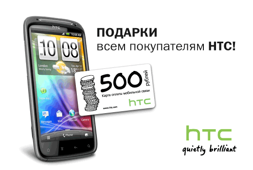 Компания МакЦентр рада сообщить о том, что начиная с 1 ноября каждый покупатель мобильных устройств HTC в фирменном магазине компании в ТЦ "Европейский" получит в подарок универсальную карту оплаты мобильной связи номиналом 500 руб. Фирменный магазин HTC - это всегда самый большой выбор коммуникаторов HTC, а также различных аксессуаров к ним.