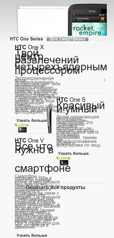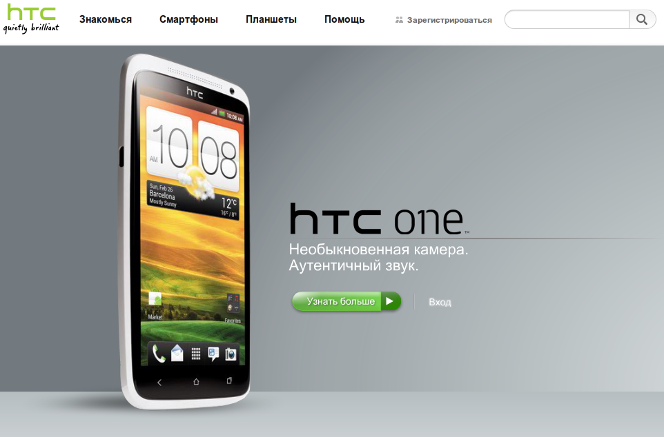 Маркетологи HTC по всей видимости отдают себе отчёт, что чем больше времени пользователь проводит на плохом сайте, тем меньше ему это нравится. Поэтому серия HTC One расположена на самой поверхности сайта HTC.com. Максимум один клик мышкой, и вы видите информацию о новой мобильной легенде. А дальше никто и не полезет. Да и не за чем.