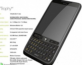 Благодаря новой утечке, у нас появилась возможность ознакомиться с фото и перечнем спецификаций новейшего смартфона HTC Trophy. Как сообщают источники, новая модель будет представлять собой обновленную версию смартфона HTC Snap, оснащенную сенсорным дисплеем и операционной системой Windows Mobile 6.5. Спецификации приведены ниже: - 3-дюймовый емкостный сенсорный экран