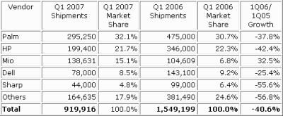 Аналитическая компания IDC подвела итоги первого квартала 2007 года для рынка карманных компьютеров. Вот уже 13 кварталов подряд эта область демонстрирует снижение по сравнению с аналогичными периодами прошлых лет. Пользовательские интересы всё больше устремляются в область конвергентных мобильных устройств, сочетающих возможности КПК с функцией сотовой связи, а также другой электроники, такой как мультимедийные плееры и GPS-навигаторы. В течение первого квартала были произведены поставки 900 тыс. КПК, что на 36,3% меньше результатов прошлого квартала и на 40,6% меньше результатов первого квартала прошлого года. В этом же квартале один из лидеров области, компания Dell, объявила об уходе с рынка КПК. На первом месте по объёмам поставок находится компания Palm, но даже она переживает спад, продажи упали ниже отметки в 300 тыс. устройств. На втором месте по-прежнему находится компания HP и также не может похвастаться ростом продаж. При этом компания не стесняется выводить новые модели на рынок - яркий пример тому rx4240 Mobile Media Companion и rx5915 Travel Companion. Компания Mio - единственная из пятёрки лидеров продемонстрировала положительный результат по сравнению с прошлым годом, она увеличила отрыв от компании Dell, находящейся на 4 месте. Одна из причин - вывод новых моделей P350 и P550. Компания Dell продала за квартал менее 100 тыс. КПК, чего с ней не случалось с конца 2002 года. Ожидается, что до конца года она будет продолжать поставки собственных КПК избавляясь от остатков. На пятом месте находится компания Sharp, она продемонстрировала самый большой спад по сравнению с прошлым годом. Компания имеет небольшой отрыв от других производителей, таких как Medion, ASUSTeK и Acer.