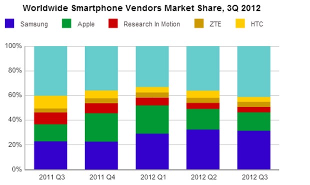 Компании Samsung и Apple по-прежнему являются безусловными лидерами на мировом рынке смартфонов, причем, их отрыв от прочих производителей стал еще больше. Об этом свидетельствуют данные официальной статистики IDC за третий квартал 2012 года. К примеру, корейский вендор поставил за прошедшие три месяца 56,3 миллиона “умных телефонов”, что позволило ему занять почти треть (31,3 процента) рынка в этом сегменте и увеличить свое присутствие там по сравнению с тем же периодом прошлого года.
