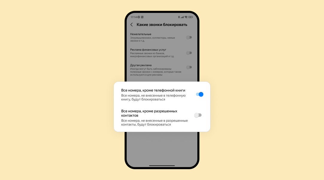 Иллюстрация: ЯндексНастроить определитель можно так, чтобы принимать звонки только от знакомых людей и важных организаций, сохранённых в контактах. Ранее была доступна возможность блокировать звонки только с конкретных категорий номеров, например, рекламных. Теперь же можно заблокировать вызовы с любых номеров, кроме разрешённых.