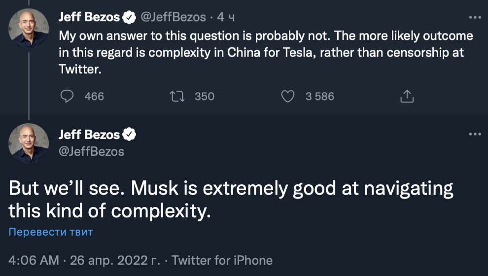 Позже Безос заявил, что Twitter вряд ли столкнется с проблемами в Китае, а Tesla может.