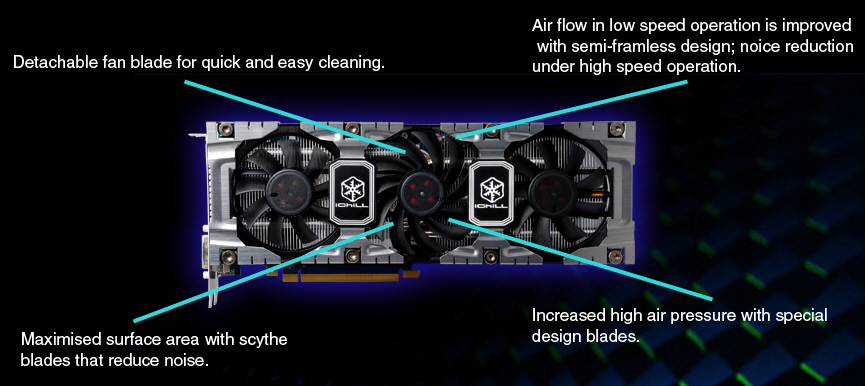 Компания Inno3D официально анонсировала свою оригинальную по исполнению версию NVIDIA GeForce GTX 680, о разработке которой мы недавно писали. Как и ожидалось, основной изюминкой новинки под названием iChill HerculeZ 3000 GTX 680 (и никаких “ледяных драконов”!) стала ее система охлаждения, занимающая два слота расширения на материнской плате и включающая в свой состав три вентилятора. Причем, как нетрудно заметить, центральный “карлсон” отличается от боковых количеством и формой лопастей.