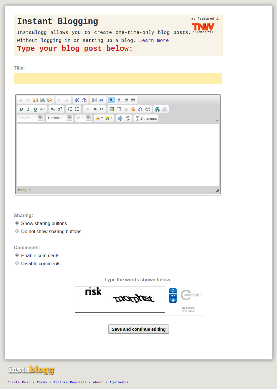 Сервис InstaBlogg делает процесс публикации максимально беспроблемным. Просто заполняете заголовок и тело поста и получаете ссылки для редактирования и для публикации. Весь интерфейс состоит из симпатичного визивига и настроек добавления комментариев (через Disqus) и социальных кнопок (через AddThis).