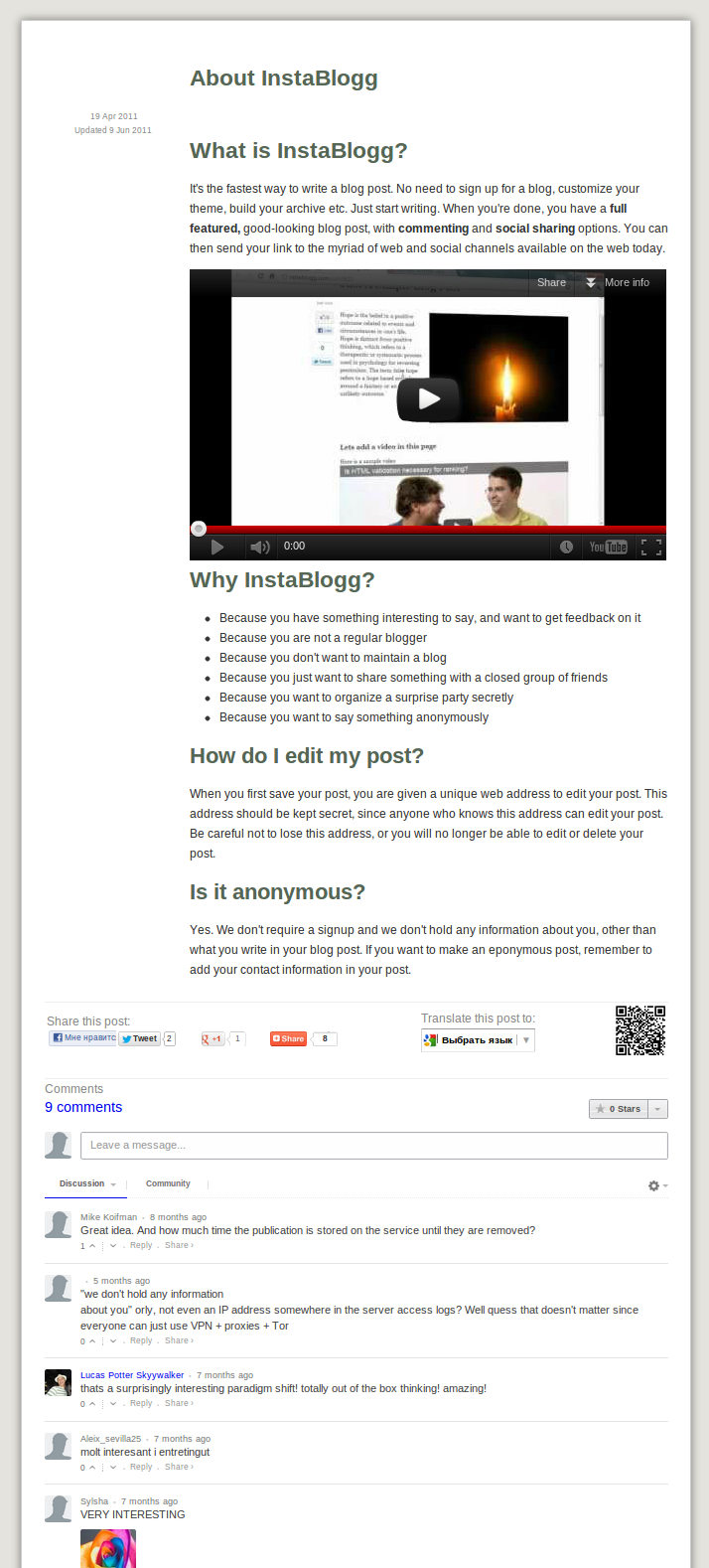 Сайт InstaBlogg создан для случаев, когда просто хочется что-то написать и выложить в сеть. Потом разослать друзьям ссылку, собирать лайки, читать комменты и всё такое. Ведь совсем не обязательно в таком случае заводить полноценный блог, будь то аккаунт на Livejournal или последняя версия Wordpress на отдельном домене. В массе своей блоги уже давно заводятся не чтобы писать туда что-то умное, а чтобы мериться количеством френдов. Когда нам попадается такая редкая штука, как хороший интересный пост в чьём-то блоге, нас интересует только его заголовок, основной текст, отчасти комментарии и, изредка, социальные кнопки. Далеко не всегда там к месту вся эта обвязка, позволяющая объединять и хронологически упорядочивать посты о котятах, о PHP, об отпуске и о смысле жизни. Читателю некой статьи далеко не всегда нужно занудно объяснять, что это не просто статья, а пост в большом и интересном блоге, который срочно нужно френдить и фолловить. Сайт InstaBlogg позволяет отвлечься от инфраструктуры блога и просто опубликовать пост.