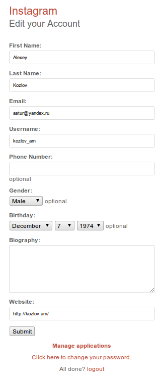 Вообще, сила Instagram не в том, что в этом сервисе есть, а в том, чего в нём нет. Вот, например, нет у Instagram веб-интерфейса, так это же явный плюс. Дело даже не в том, что можно экономить на хостинге, так как через iPhone загружают меньше фотографий, чем с компа (ещё не факт). Давайте задумаемся, что было самым отвратительным во всех этих многочисленных "фотохостингах для Твиттера"? Конечно же это их мерзкие дилетантские попсовые веб-интерфейсы. У Instagram вообще нет веб-интерфейса, только вот такая формочка настроек аккаунта: