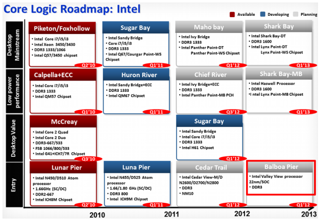 Стали известны свежие подробности о планах Intel в отношении своей процессорной линейки Atom, решения в рамках которой активно применяются в нетбуках, неттопах и потребительской электронике, а также в планшетных компьютерах. Судя по утекшему в сеть роадмапу, в следующем году мировой чипмейкер планирует выпустить CPU под кодовым именем Valley View, которые будут относиться к категории “система-на-чипе” и войдут в состав платформы Balboa Pier.