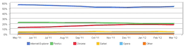 Похоже, худшие времена для браузера Internet Explorer, когда его доля на глобальном рынке неуклонно снижалась месяц за месяцем, остались позади. Во всяком случае, за последние несколько месяцев популярность этого творения Microsoft, в общем и целом, стабилизировалась и даже имеет некоторую тенденцию к росту. Об этом свидетельствуют и последние официальные данные от Net Applications, согласно которым доля IE на рынке десктопных интернет-обозревателей в марте составила 53,83 процента, тогда как в феврале аналогичный показатель равнялся 52,84 процента.