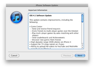 Компания Apple официально выпустила операционную систему iOS 4.1– сборку, проходящую под номером 8B117. Согласно официальным данным, ОС совместима c iPhone 3G, iPhone 3GS, iPhone 4, а также iPod touch второго и третьего поколений. Среди главных особенностей iOS 4.1стоит выделить возможность получать, хранить и обрабатывать фотографии HDR (High Dynamic Range) на iPhone 4, а также загружать с помощью смартфона HD-видео на YouTube и MobileMe. Кроме того, iOS 4.1 включает в себя новый игровой сервис Game Center, который, как известно, не будет совместим с iPhone 3G. Новая система также содержит некоторые исправления, призванные устранить проблемы с датчиком близости и Bluetooth у iPhone 4, а также снижением производительности новой ОС на iPhone 3G. Также известно, что iPod touch четвертого поколения будет поставляться уже с предустановленной iOS 4.1.