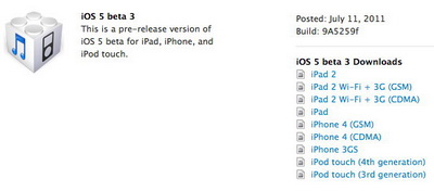 Компания Apple заявила о том, что для загрузки доступна третьей бета-версии iOS 5. Как водится, данная версия прошивки рассчитана на разработчиков, а не на простых пользователей. Сообщается, что это последний предварительный релиз пятого поколения мобильной платформы для iPhone, iPad и iPod touch. По информации разработчиков, успевших загрузить сборку, 9A5259f, пользователи службы iMessage на iOS 5 beta 3 не смогут общаться с пользователями iMessage, у которых установлена версия iOS 5 beta 1. При этом общение между beta 3 и beta 2 осуществляется без каких-либо проблем.Кроме того, сообщается, что в новой бета-версии исправлена ошибка, которая приводила к тому, что после перехода приставки Apple TV в режим скринсейвера заметно ухудшалось качество изображения при транслировании контента через беспроводной стандарт AirPlay. Помимо всего прочего, в новой бета-версии устранена ошибка, когда приложение «Напоминания» не отсылало уведомления при входе или выходе из какого-либо местоположения, если с напоминанием, привязанным к этому местоположению, не было ассоциировано никакой конкретной даты.