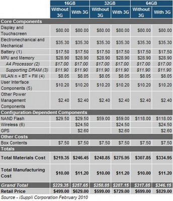 По информации аналитической компании iSuppli, общая стоимость компонентов 16-гигабайтной версии новейшего планшетного компьютера iPad, розничная цена которого начинается с 499 долларов, составляет $219,35. По данным аналитиков, 9,7-дюймовый сенсорный дисплей обошелся Apple примерно в 80 долларов, в то время как процессор A4 (предположительно произведенный Samsung) стоит ориентировочно 17 долларов, то есть на 2 доллара больше, чем процессор на смартфоне iPhone 3GS. На 16-гигабайтный модуль памяти компания потратила около $29,50. В результате анализа было заключено, что итоговая стоимость устройства, составившая $219,35, существенно ниже 499, которые Apple просит за 16GB iPad без 3G-модуля. Даже с учетом расходов на производства, которые составляют всего 10 долларов на единицу, получается $229,35, что более чем вдвое меньше розничной цены. Тем не менее, ожидается, что 16-гигабайная версия станет наименее прибыльной для Apple. Компания iSuppli прогнозирует, что больше всего Apple заработает на продажах 32-гигабайтной модели, которая будет оснащена 3G и поступит в продажу с ценником $729. Производство этой модели обходится корпорации в $287,15.