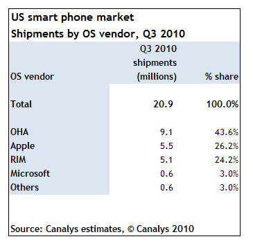 По результатам третьего квартала текущего года самым продаваемым смартфоном в США снова стал iPhone, на который пришлось 26,2 процента от общего объема поставок. Однако, если сравнивать его продажи с совокупным объемом продаж устройств на базе операционной системы Android, то становится ясно, что iPhone уже существенно уступает мобильной платформе Google: все устройства Android вместе взятые сегодня контролируют 43,6 процента этого сегмента рынка. При этом аналитики, что Apple пока не удается сильно оторваться от компании Research in Motion, которая занимает второе место в США со своими 24,2%. Однако это обстоятельство ситуации не меняет: обойдя в прошлом квартале RIM, сегодя Apple является самым успешным производителем смартфонов в США и во всем мире. На этом фоне отмечается, что совокупная доля поставок устройств на базе мобильной ОС Android на американский рынок в третьем квартале составила 43,6%. Аналитики заявляют, что всемирный объем продаж устройств на базе этой ОС вырос на 1 309 процентов относительно аналогичного периода в прошлом году. В общей сложности за третий квартал 2010 года было продано более 20 миллионов таких устройств.