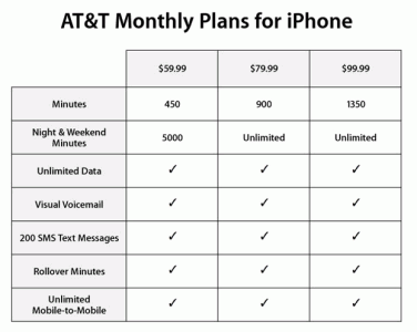Компания Apple и американский оператор AT&T опубликовали дополнительные подробности, связанные с покупкой мобильного телефона iPhone. Были обнародованы тарифные планы, которые предложит AT&T покупателям iPhone. Напомним, что iPhone начнёт продаваться в пятницу, пока только исключительно у AT&T. Купив iPhone за $499 (модель с 4 Гб памяти) или $599 (модель с 8 Гб памяти) пользователь должен заключить двухлетний контракт с оператором. То есть предлагаемые тарифы, фактически входят в общие затраты на новинку, не зная их нельзя было спрогнозировать во что выльется в конечном счёте покупка iPhone. Тарифы предлагаются в индивидуальном порядке и семейные. Индивидуальные тарифы предусматривают ежемесячную плату в $59,99, $79,99 или $99,99 которая включает 450, 900 или 1350 оплаченных минут соответственно. Кроме того, тарифы предусматривают безлимитный доступ к данным, безлимитные голосовые звонки с мобильного на мобильный, 200 SMS, услугу Visual Voicemail. Также взимается разовый платёж для активации - $36. Ещё одна подробность, опубликованная компаниями - пользователи, прибредшие iPhone, смогут активировать его самостоятельно. Это позволит не задерживаться в магазине, ожидая активации. Для этого понадобится программа iTunes на компьютере Windows или Mac OS X. Пользователь выберет тарифный план, авторизует счёт и активирует iPhone. После активации станет возможна синхронизация контактов, календаря, e-mail, закладок, музыки, фото, видео и так далее.