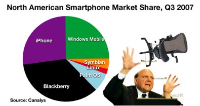 Аналитическая компания Canalys опубликовала отчёт о своих исследованиях динамики американского рынка смартфонов в третьем квартале 2007 года. Если раньше этот рынок делили платформы Windows Mobile и RIM BlackBerry, то теперь к ним прибавился третий сильный игрок - iPhone. C единственным аппаратом компания Apple захватила более четверти рынка, обогнав весь сектор Windows Mobile и вплотную приблизившись к лидеру. Напомним, что с третьего квартала популярность iPhone выросла ещё больше, так что возможно, что сейчас на американском рынке смартфонов новый лидер, хотя аналитической информации по этому поводу ещё нет. Также аналитики привели статистику использования страниц интернет американскими пользователями мобильных устройств. В этой области Apple iPhone не просто лидирует, а занимает долю в 47 процентов, почти обгоняя Windows Mobile и Symbian вместе взятых. Отметим, что пока компания Apple ещё не бралась всерьёз за рынки остальных стран, но движение в этом направлении началось, и возможно скоро аналогичная ситуация воплотится в мировых масштабах.