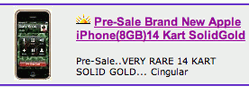 Интернет-ресурс Business 2.0 сообщил интересную новость - на аукционах интернет-магазина eBay уже можно купить не только простой мобильный телефон "iPhone", якобы от компании Apple, но и эксклюзивную вервию с 8 Гб встроенной памяти, выполненную с использованием золота. Цены на "iPhone" на eBay колеблются от $1000 до $10000, "золотой" iPhone конечно тоже не относится к разряду дешёвых. Любопытно, что эти лоты могут оказаться вполне настоящими - многие из них отмечены как "pre-sales" (предварительная продажа). Согласно политике eBay продавец в таком случае должен обеспечить доступность устройства в течение 30 дней с начала аукциона. Согласно же самым оптимистичным прогнозам, продажи iPhone через американского оператора AT&T (бывший Cingular) должны начаться в начале июня. Правда компания Apple пока обещала только, что старт продаж состоится до конца июня. Помимо таких случаев перепродажи, на eBay продаётся множество подделок, муляжей и просто телефонов слегка похожих на iPhone.