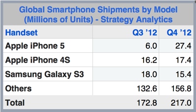 Согласно аналитическому исследованию рынка от компании Strategy Analytics в четвертом квартале 2012 года, самым продаваемым смартфоном в мире признан iPhone 5. По данным экспертов, в прошлом квартале компания из Купертино поставила 27,4 миллиона iPhone 5, то есть на эту модификацию пришлось 12,6% всех поставок смартфонов в четвертом квартале. Примечательно, что на втором месте рейтинга оказался iPhone 4S, который разошелся по миру тиражом в 17,4 миллиона штук и занял 8% рынка смартфонов. А на долю Samsung Galaxy S III пришлось лишь 7,1% поставок. Он замкнул тройку лидеров с результатом в 15,4 млн поставленных гаджетов. Таким образом, в предпраздничный квартал смартфоны от Apple вырвали лидерство у корейского гаджета. По заявлению Strategy Analytics, основополагающими успеха iPhone 5 стали его большой сенсорный экран, широкое распространение по всему миру и субсидии, предлагаемые сотовыми операторами. Каждый пятый проданный в последней четверти 2012 года смартфон был либо iPhone 5, либо iPhone 4S.
