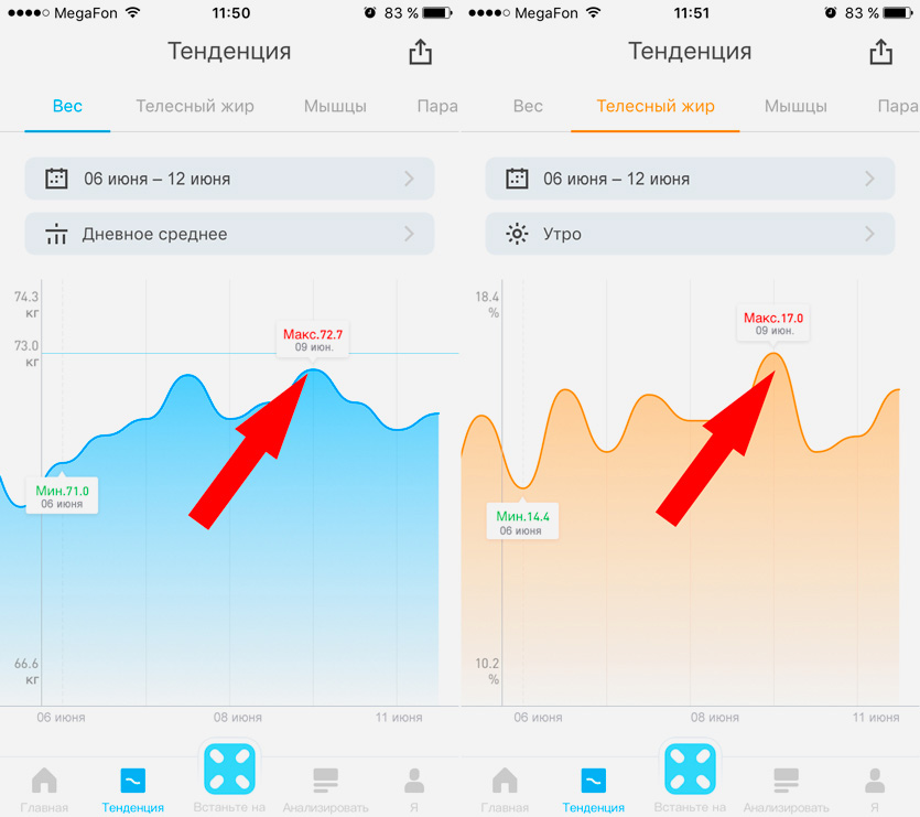 Кроме графиков с аналитикой по всем параметрам и отслеживания прогресса похудения, весы дают полезные советы.