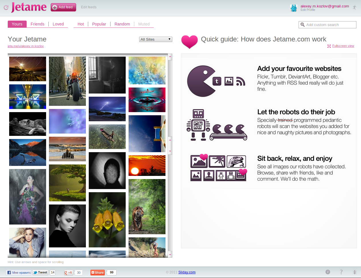 Казалось бы, можно всё то же самое смотреть в любом RSS-ридере, но тогда кроме картинок в глаза постоянно будет лезть какой-то текст, который со временем начнёт восприниматься как спам. Колоссальный успех фотоблогов доказывает, что иногда люди не хотят ничего читать, а хотят просто посмотреть картинки. Сайт Jetame сделан именно для таких людей.